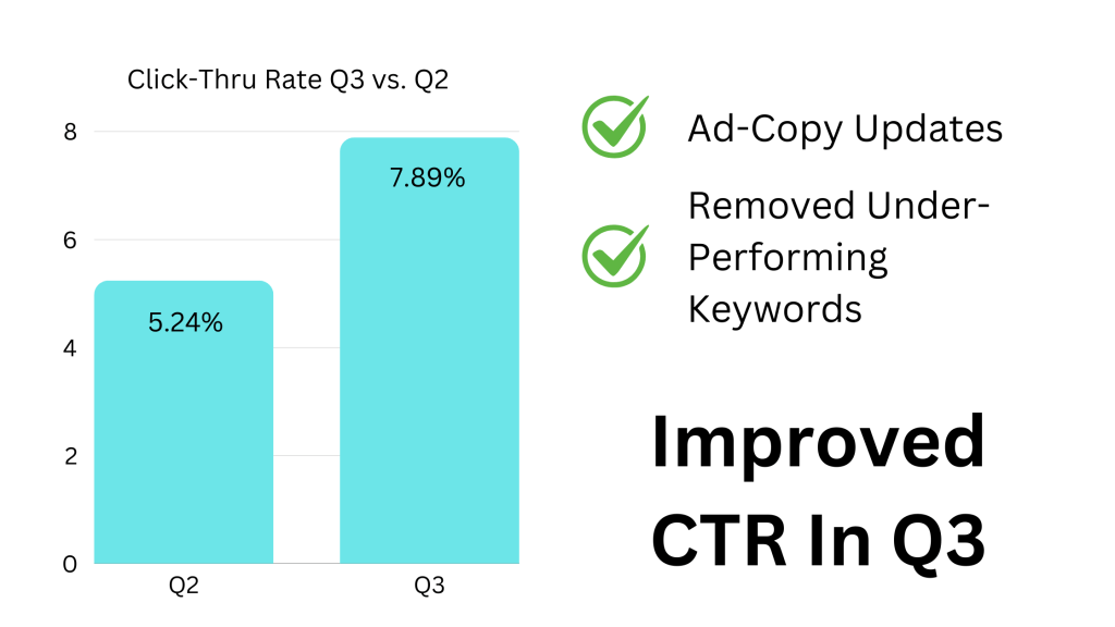 In Q3, our campaign Click-Thru Rate (CTR) improved to 7.89%, up from 5.24% in Q2, due to updating the campaign ad copy and removing the under-performing keywords. Improving our CTR, means that our campaign is targeting users who are more likely to click on our ads. This improvement can help us better reach our ideal customers and maximize our advertising budget.